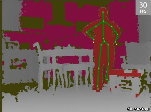 ИК датчик KINECT это не просто дальномер. Обычный дальномер формирует данные содержащие информацию о расстоянии до одной единственной точки объекта находящийся перед датчиком. ИК камера Kinect формирует облако таких точек позволяющее построить трехмерную картинку сцены перед сенсором. Дальность работы ИК сенсора от 0,8 до 6,0 метров. На выходе получаем карту глубины с частотой до 30 кадров в секунду.