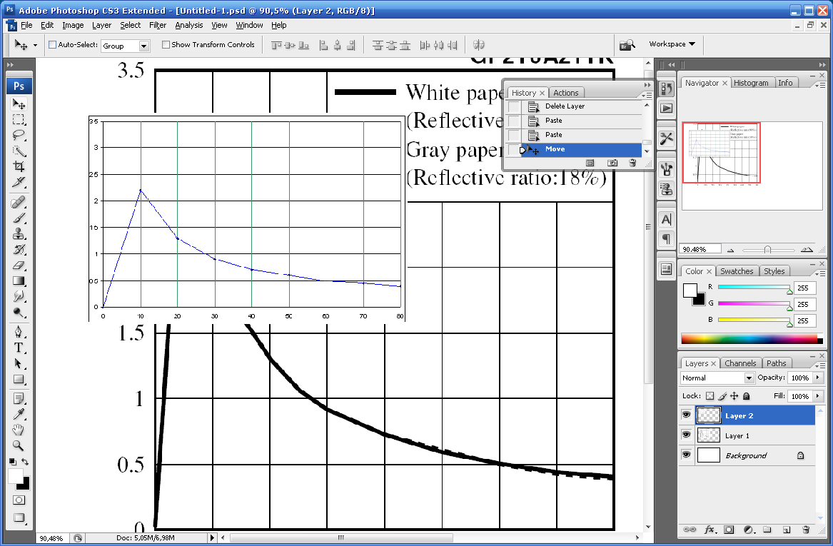выставляем у верхнего слоя прозрачность ~60% и тулзой free transform (правый клик мышью с инструментом "выделение") подгоняем графики друг к другу: