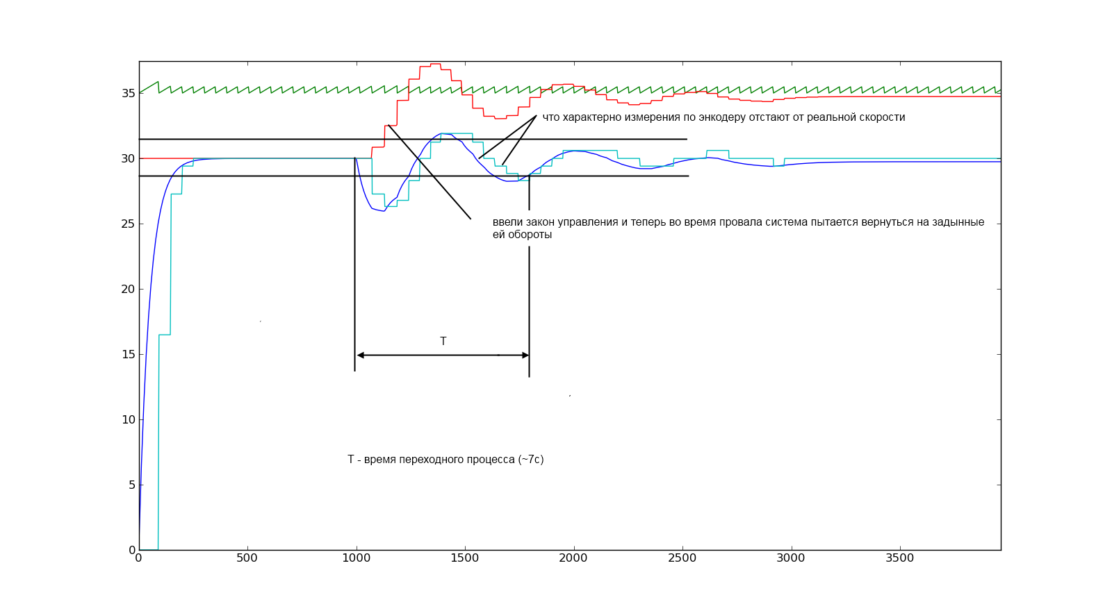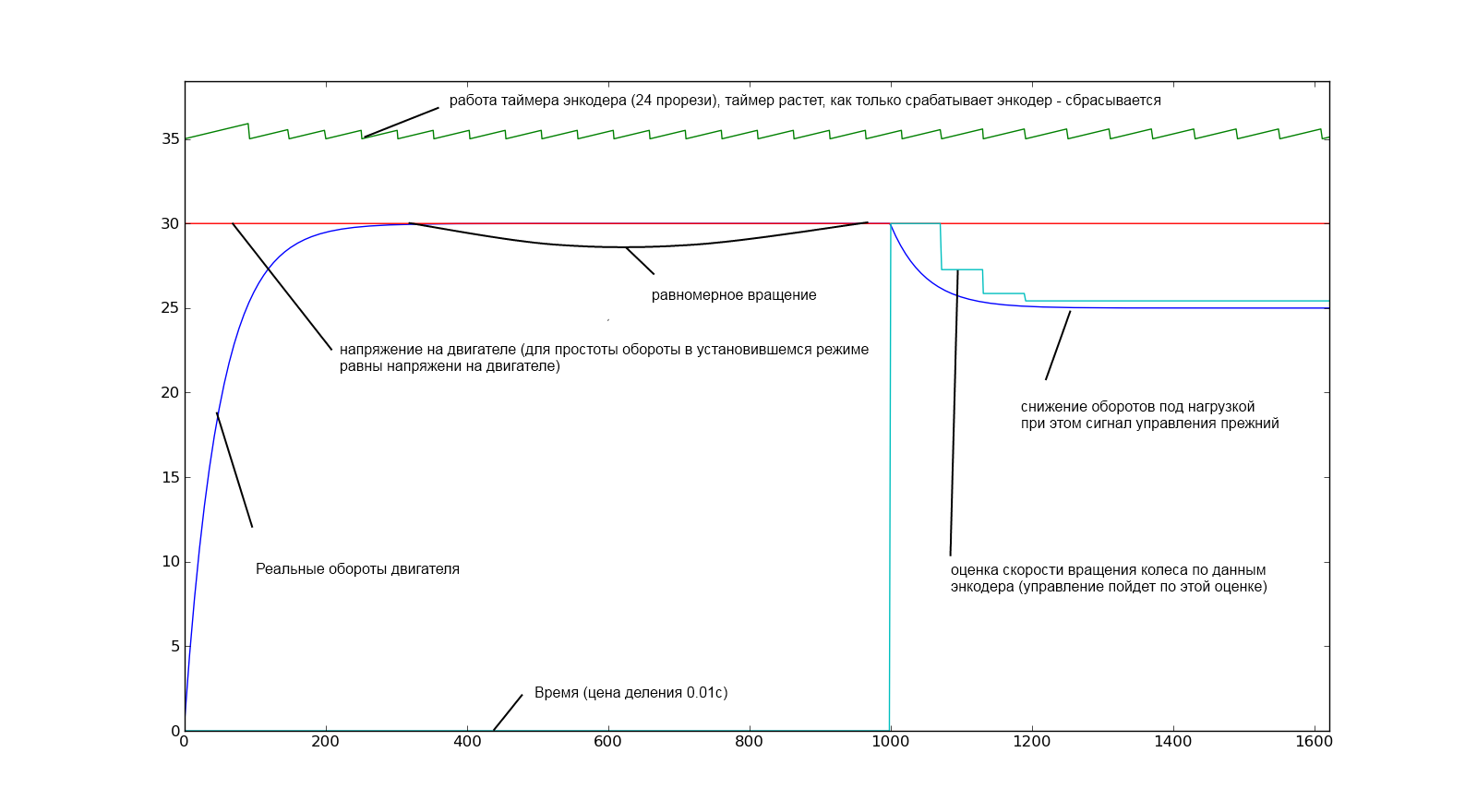 Ну с сервой все понятно. Во первых у нее достаточно широкий диапазон по управлению, т.е. движок не совсем игрушечный (под движком я кстати подразумеваю двигатель+редуктор), во-вторых у нее обратная связь по положению в любой момент времени, причем и задача стоит как задача стабилизация положения, а не скорости.