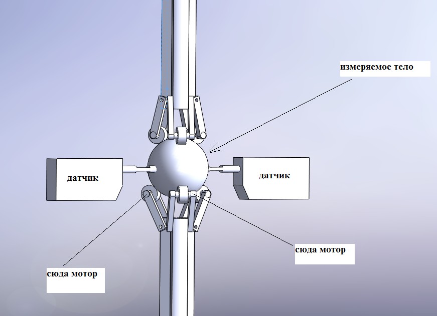 Тело вращается двумя шаговыми приводами в 2-ух разных плоскостях. Датчики линейных перемещений тем временем делают 100 замеров (примерно).