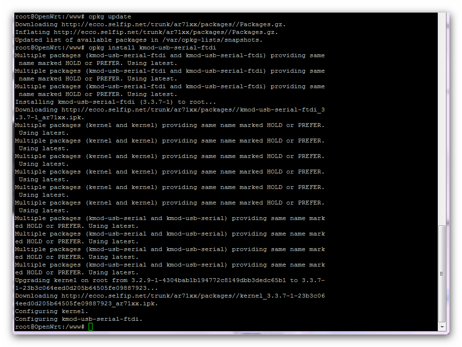 - для 703N устанавливается пакет kmod-usb-serial-ftdi_2.6.32.27-1_ar71xx.ipk 21-Dec-2011 00:54