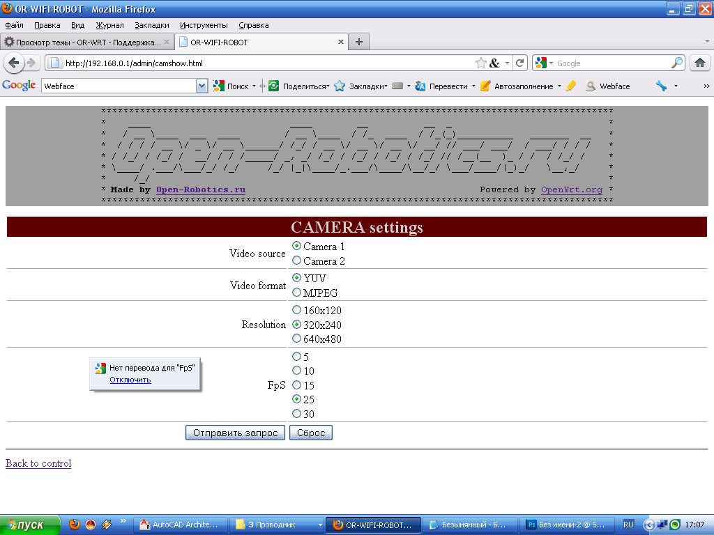 TP-LINK поддерживается только через USB-UART адаптер, мне не удалось добиться стабильной работы встроенного uart. Возможно, это из-за моей криворукой пайки. В настоящий момент моя рефреренс-платформа ("голова профессора Вейдера") несет на себе 2 камеры (Logitech C-100 и wanscam) и блютуз-адаптер. Чуть позже будут фото.