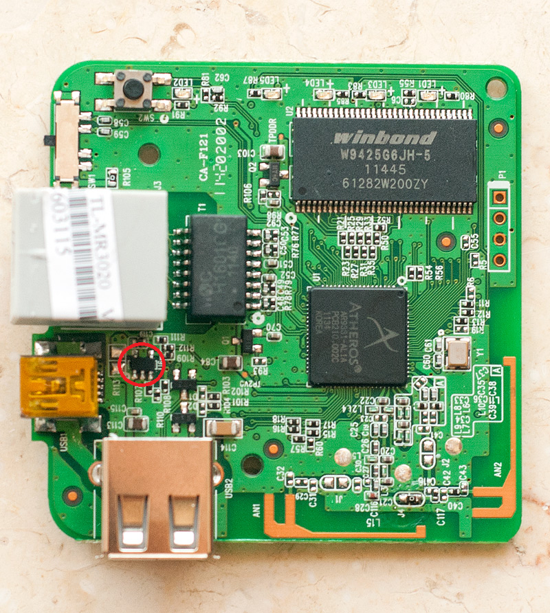 Решил сделать апгрейд тележке и загубил по моему стабилизатор напряжения питания подключаемого к роутеру USB устройства. У кого-то есть схема роутера? Необходимо опознать стабилизатор и понять какая нога за что отвечает и можно ли его заменить и на что? Предполагаемое место гибели детальки обвел как и положено красным мелом на фото ниже.