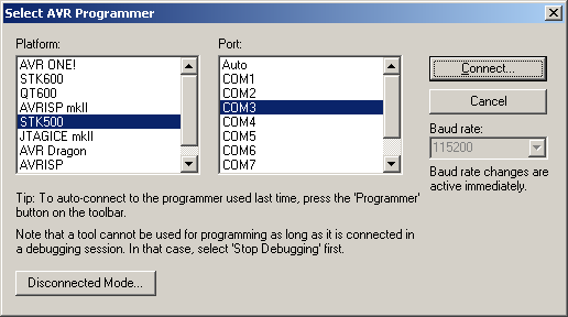 Выбираем STK500 и порт. Жмем "Connect".