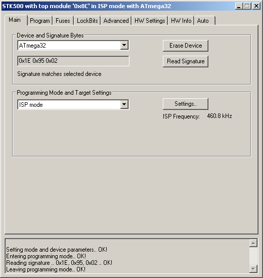 Переходим на вкладку "Program", в разделе "Flash" выбираем HEX-файл, жмем "Program". В окне внизу появляются сообщения. Если все в порядке - последним будет "Leaving programming mode.. OK!"