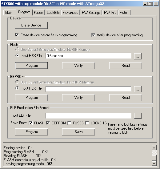 Переходим на вкладку "Program", в разделе "Flash" выбираем HEX-файл, жмем "Program". В окне внизу появляются сообщения. Если все в порядке - последним будет "Leaving programming mode.. OK!"