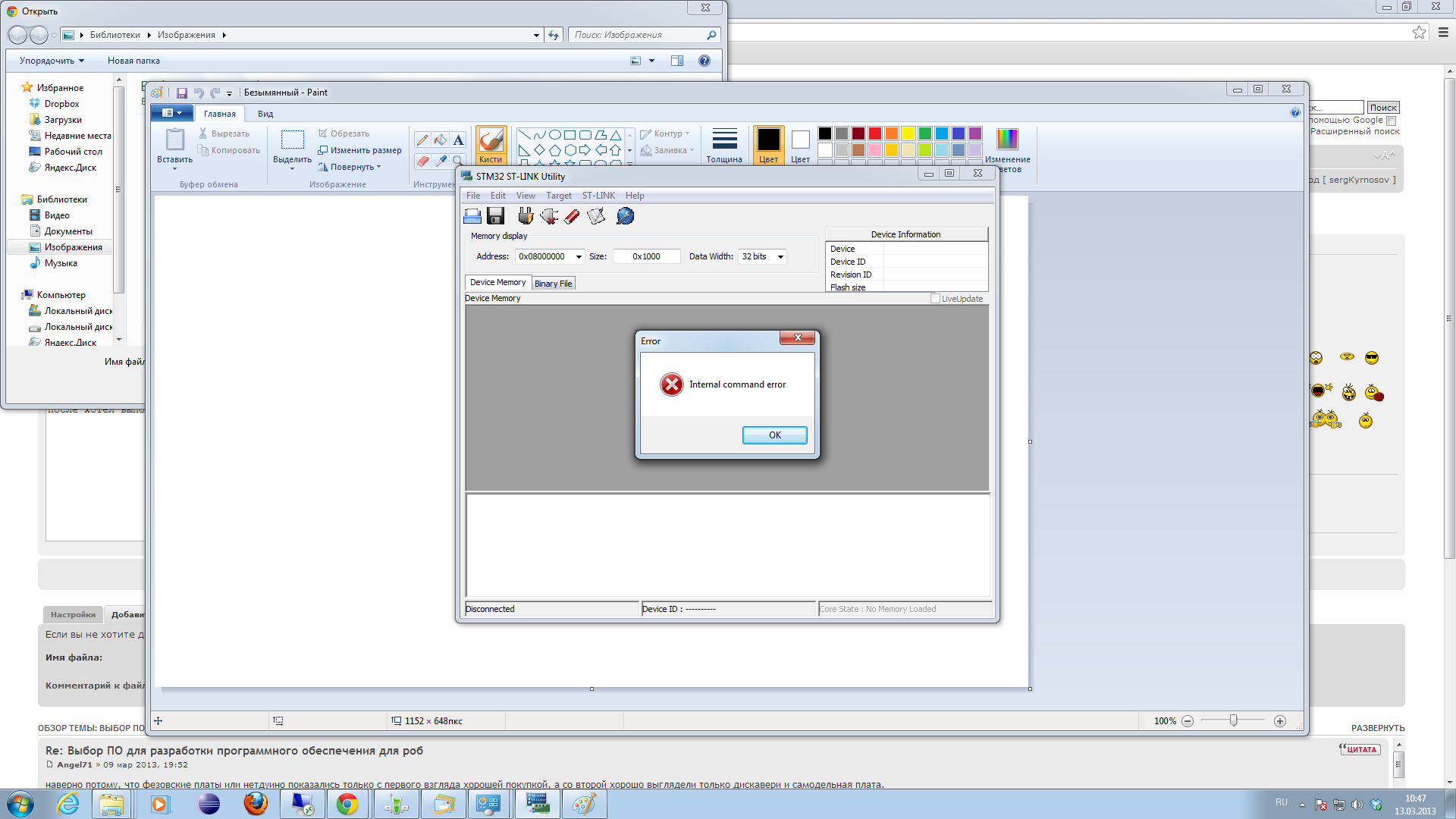 после хотел выполнить все еще раз, но при попытке подключиться к плате утилитой STM32 ST-LINK Utility выдается ошибка (см вложенный файл).