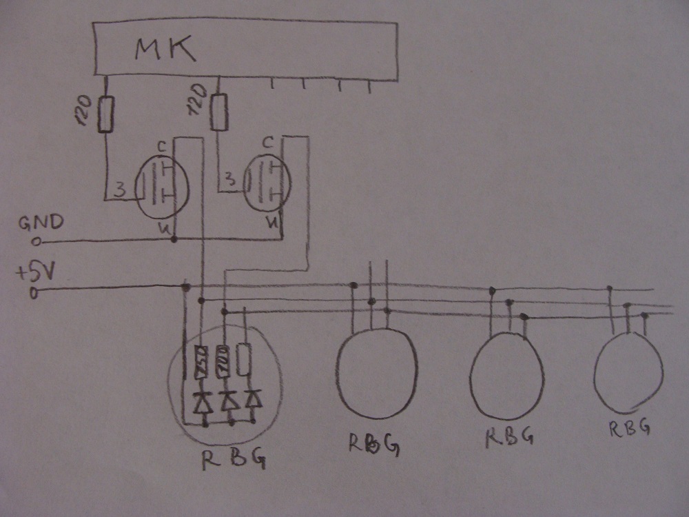 Принцип работы: светодиоды на 5V с общим анодом, RGB (три диода в одном кристалле, в схеме то что внутри диода обведено в кружок), обвязаны в несколько отдельно управляемых групп мощностью до 15-20W. Коммутирует пучки диодов полевик IRFZ44N, управляемый ШИМ импульсами с выходов МК. Программой задано соотношение ШИМ красного и синего диодов 220/54 (вывод "-" от зеленого диода остается висеть в воздухе так как не задействован), параметр ШИМ на выходах меняется в течение программы но соотношение остается примерно такое. В этом же устройстве подключены другие диоды управляемые без ШИМ, но с ними проблем нет.
