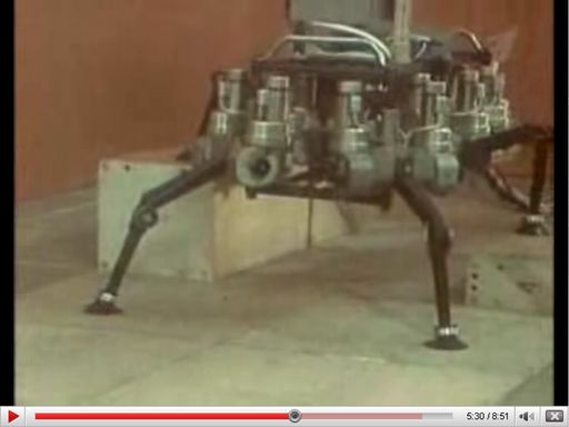 Может-ли кто-нибудь поведать какую-либо информацию о шестиногом роботе на приведённых (во вложении) кадрах? Я так понимаю,что это советская разработка 80-х годов.Кадры взяты из док.фильма "Боевые роботы"(цикл передач "Ударная сила",на российском TV).Вот ссылка на ту часть фильма,где,в числе прочих,есть фрагмент съёмок этого робота в несколько секунд и без пояснений.