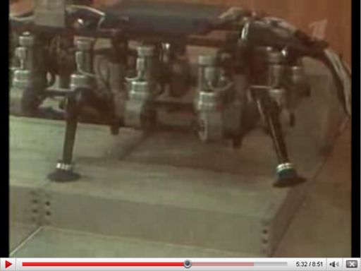 Может-ли кто-нибудь поведать какую-либо информацию о шестиногом роботе на приведённых (во вложении) кадрах? Я так понимаю,что это советская разработка 80-х годов.Кадры взяты из док.фильма "Боевые роботы"(цикл передач "Ударная сила",на российском TV).Вот ссылка на ту часть фильма,где,в числе прочих,есть фрагмент съёмок этого робота в несколько секунд и без пояснений.