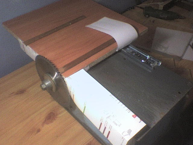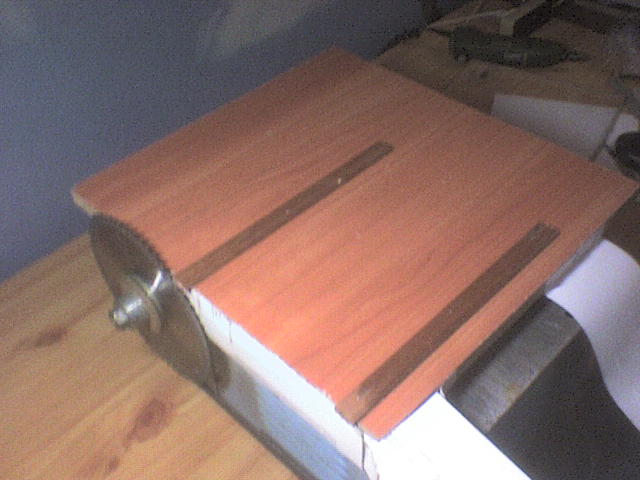 Нужно делать ровные резы, если вести заготовку руками получаеца не очень ровно, поэтому добавил к нему две направляющие и столешницу.