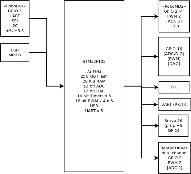 Сам модуль будет иметь только два канала моторов, но RoboMD2 будет независим от встроенного моста. Плюс на нем много юартов и прочих, а на уарте мнооого всего вешается.