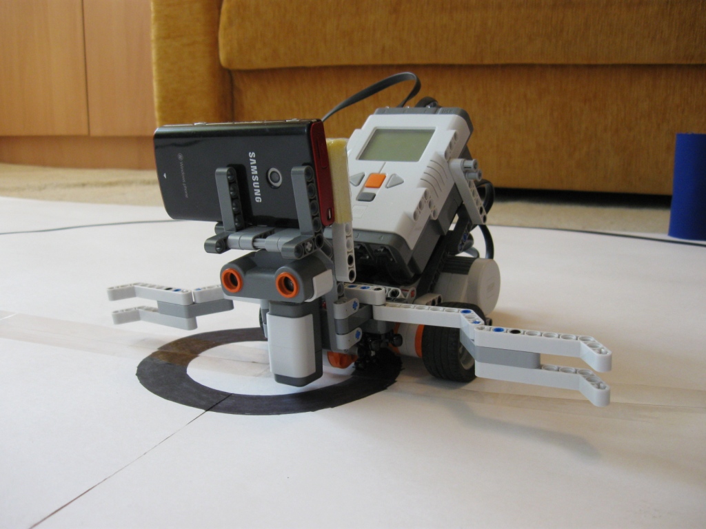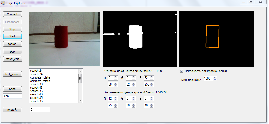 На роботе уставлен смартфон, который с помощью программы WebCameraPlus, по-сути превратился в web-камеру. Через wi-fi получаем изображение с этой web-камеры в основной управляющей программе. Основная управляющая программа с помощью доработанной библиотеки AForge.Net посылает через Bluetooth управляющие сообщения программе, которая исполняется на самом роботе. Программа на роботе, исполняет принятые сообщения и отсылает результаты в основную управляющую программу. Анализ изображения с камеры осуществляются с использованием библиотеки OpenCV и предназначен для определения цвета банки, а также коррекции положения (чтобы банка была по центру). По-сути анализ изображения достаточно тривиален (фильтр по цвету, а затем поиск прямоугольника с определенными пропорциями).