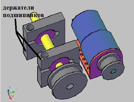 Ниже 3д чертеж в автокаде. Собственно вопрос- как мне лучше сделать держалки для подшипников?? требуется самое легкое конструктивное решение, что б можно было "сделать на коленке" но при этом было все надежно(жесткое закрепление подшипника на основании). Нагрузка на подшипники относительно поверхности закрепления минимальна, т.к. колеса не будут крепиться непосредственно на желтый вал... от него будет идти кардан.