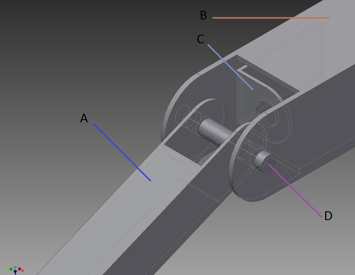 На схеме A и B - фаланги пальца, квадратный люминевый профиль 25х25х1.5 и 15х15х1.5 соответсвенно. С - крепление для моторчика, D - абстрактный вал.
