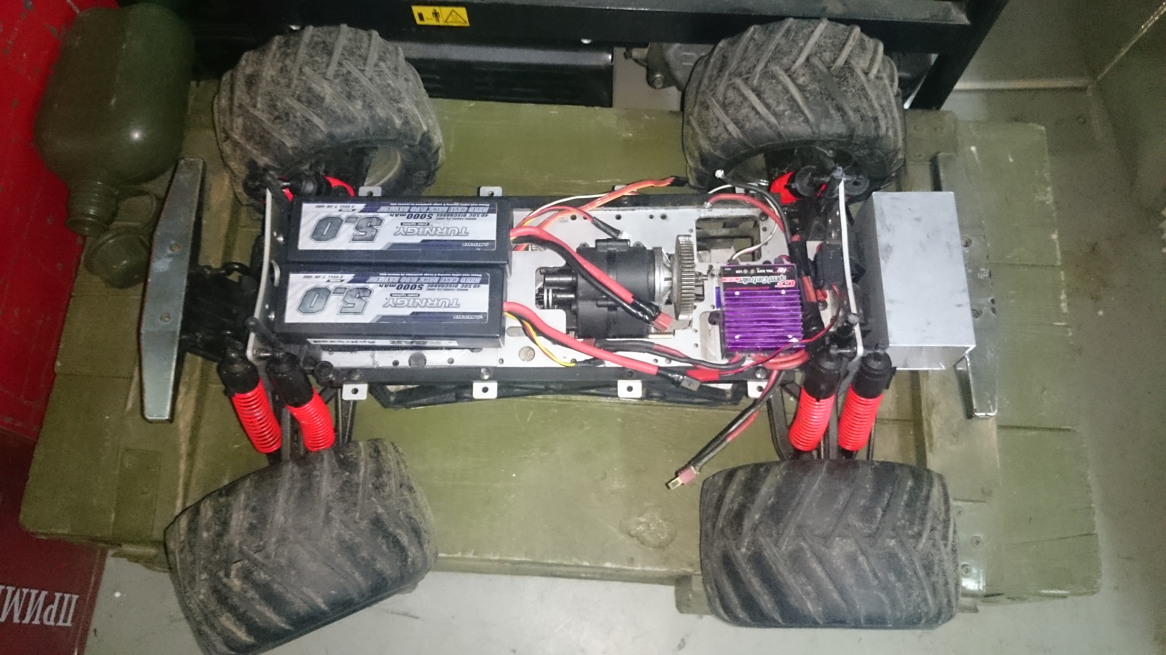 Шасси kyosho giga crusher, конверсия в электро. Питание 14,4в через регулятор от hpi e-savage, 60ампер макс. Общее примерное отношение редукторов 1-30. Вес 8-12 килограмм в зависимости от навески. Не могу под это дело подобрать движок. Пробовал от макитовского шуруповёрта, сгорел через 15 минут при попытке забраться на бордюр. Скорость нужна до 10 км/ч, тяги хватало с избытком. Подскажите, от чего можно взять мотор на такую штуку?