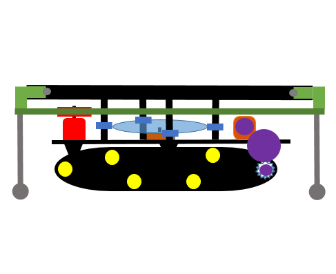 Моя идея не совсем обычной коонструкции управляемой гусеничной платформы, заключается в том, чтоб ее можно было перемещать по оси Y для подъема внутри опорного стакана, далее вращать под любым градусом, опускать и продолжать движение под заданным углом. Опорный стакан во время перемешения платформы поднят. Как вращать гусеничный блок внутри опоры, мне понятно, не решено движение по оси Y. Хотелось бы весь этот алгоритм реализовать на двух моторах. Мотор привода гусеничного трека может выполнять и вторую функцию вращения.