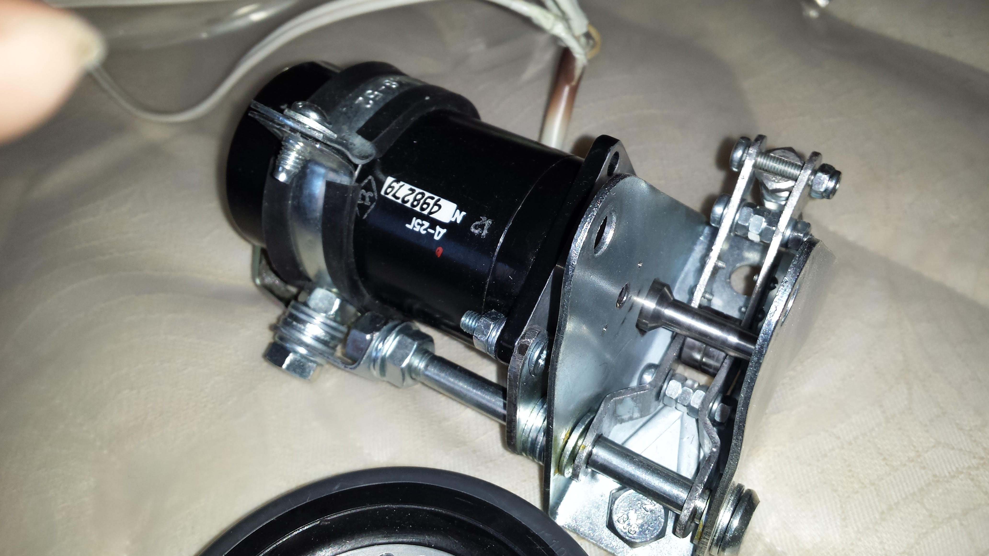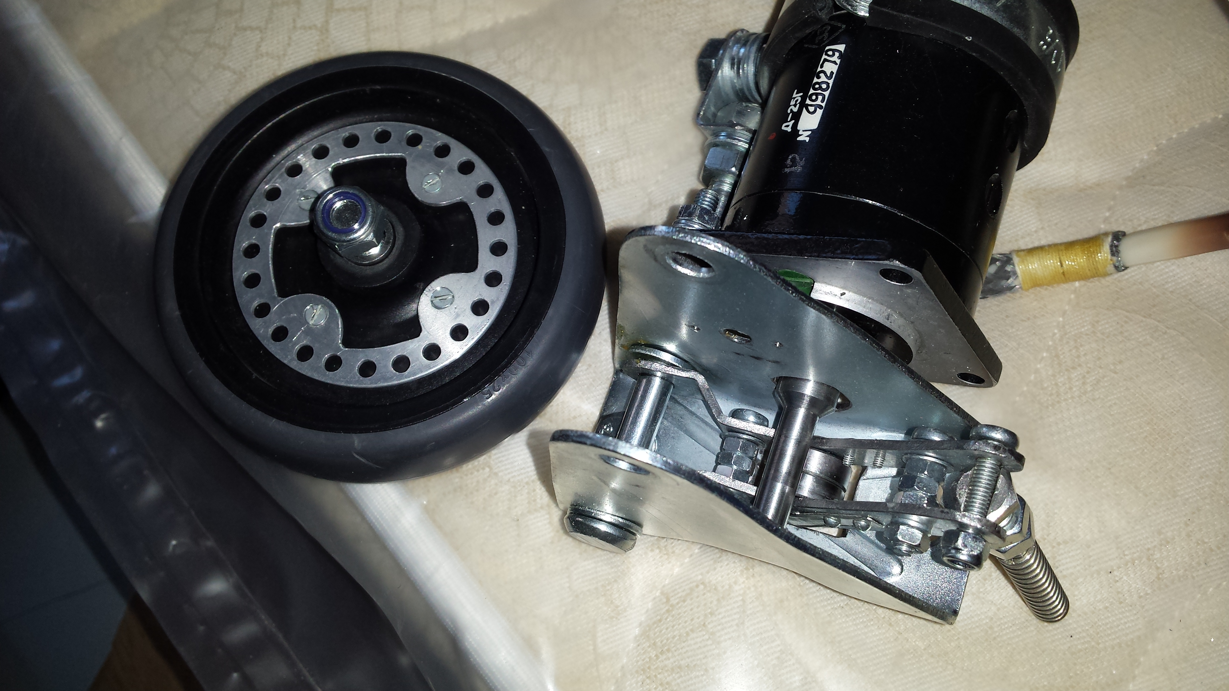 Электродвигатель прикреплен к болту с помощью хомута и пластины.Этот болт вставлен в отверстия просверленные в кронштейне колесного модуля,также и нарощенный вал входит в свое несколько расширенное отверстие внутрь кронштейна.Таким образом электродвигатель с валом под собственным весом прижимается валом к колесу.Примитивно можно было пружиной к мотору добавить усилие прижима вала к колесу но тогда многократно усиливаются нагрузки на электродвигатель и такая конструкция долго не прослужит.Поэтому прижимной механизм сделан из коромысла с подшипниками. Коромысло посредством пружины прижимает подшипники к валу который прижимается к колесу.