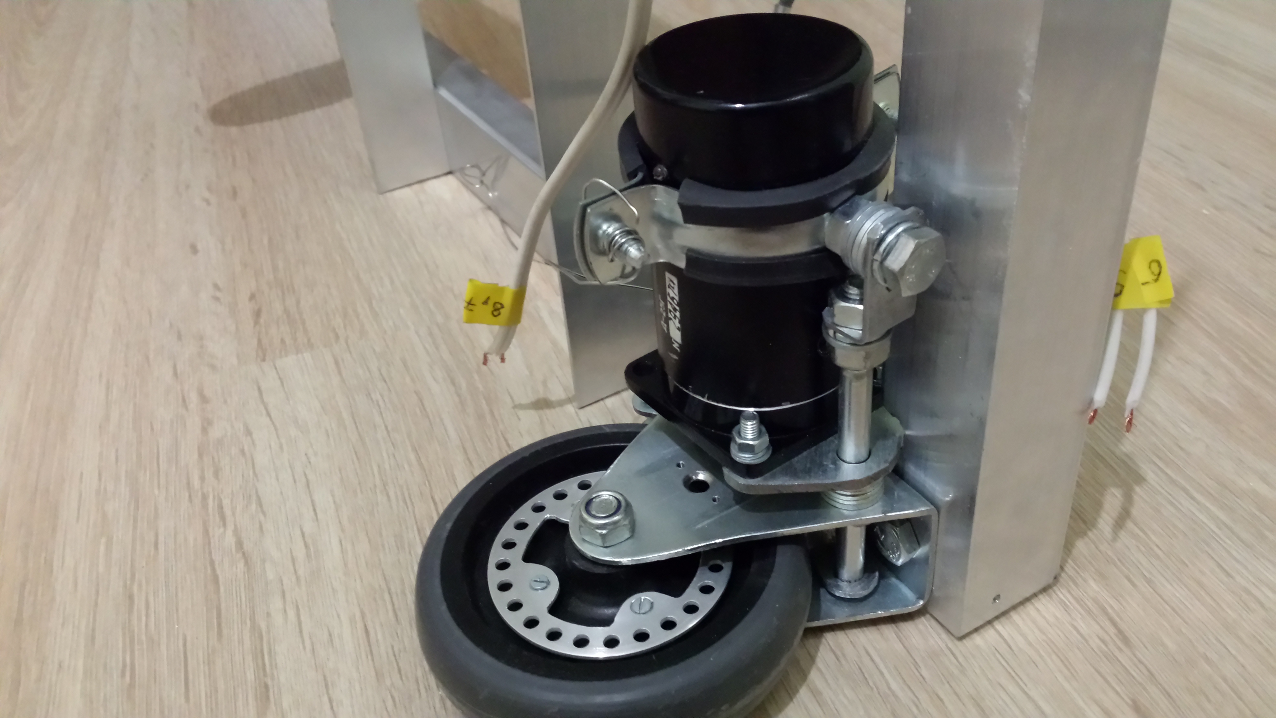 Вал электродвигателя удлинен с помощью детали выточенной на токарном из нержавейки и рабочим диаметром 7мм.Принцип работы прост.Колесо имеет твердую прочную резину,вал прижимается к колесу и передает вращение от мотора к колесу.