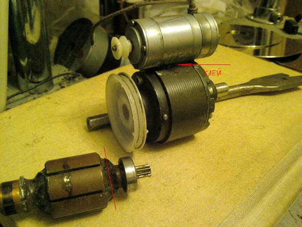 глянув на ротор я его обрезал по красной линии добавил противолювтовый второй подшипник на ось-шестерню и наклеил колесо для пасика,на корпус редуктора приклеил моторчик