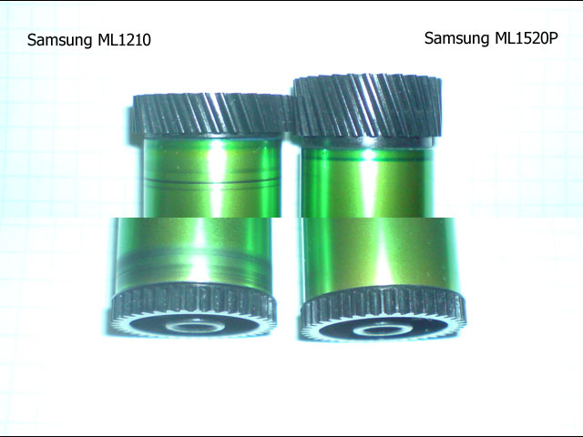 Насобирал светочувствительных барабанов, на самсунгах мл1210 и мл1520 там с обоих сторон мощные шестерни. Одна косая(можно скрутить, добавив мелкую шестерню от валиков редуктор 1:2.5), другая прямозубая(1:3). Теперь буду их спиливать пытался так достать - йух, они на клей эпоксидный посажены прочно.