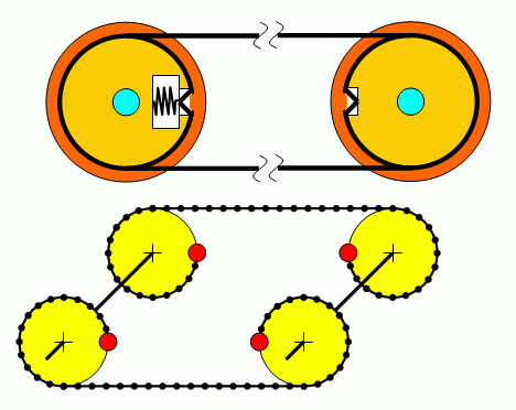 Конструкция состоит из ведущего и ведомого блоков, на которые намотан стальной тросс. Трос зафиксирован на каждом из блоков, что предотвращяет проскальзывание. Пружина предотвращает провисание троса. Данная конструкция позволяет поворачивать управляемый блок на 540 градусов (полтора оборота - или 270 градусов в одну и другую сторону)