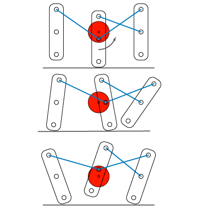 Kanoka писал(а):В идеале, при правильном подборе плеч, средняя нога будет двигатся по горизонтали на то же растояние что и крайние, что устранит виляние корпуса при ходьбе, что в свою очередь очень важно при установке на него датчиков сближения/камер.