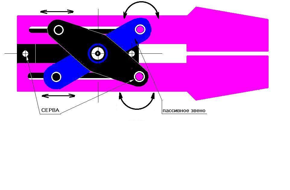 2rig: Про такой тоже думал, но хочется, чтобы угол между клешнями не менялся, иначе нетривиально будет таким манипулятором работать, хотя может я уже выдумываю