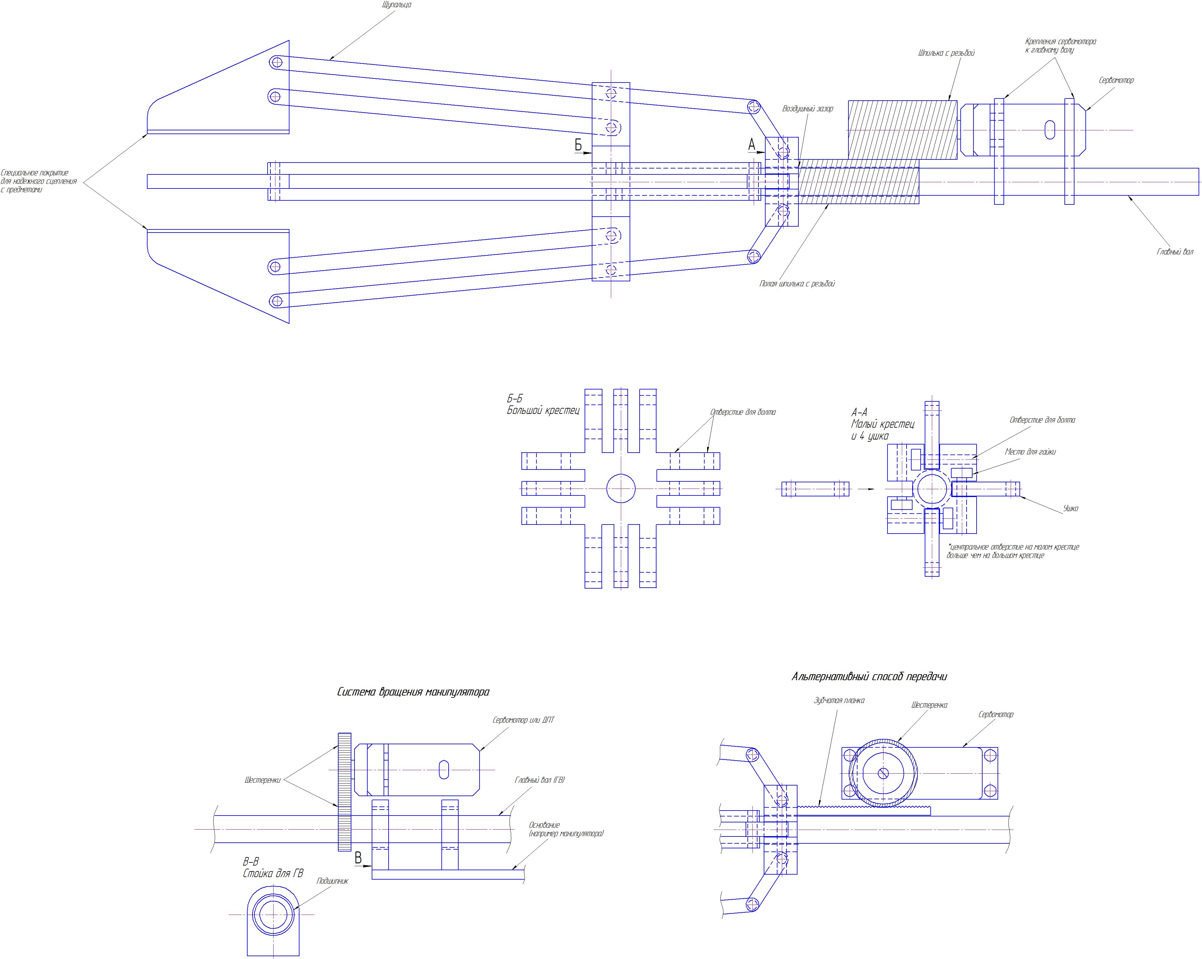 Захват. 4 щупальцы, закреплены на большом и малом крестце. Большой крестец закреплен на Главном валу. Малый крестец может двигаться водоль ГВ.