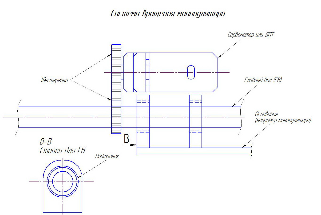 Собственно, а почему Главный вал круглый? По задумке можно поставить стойки с подшипниками и дополнительный двигатель для вращения захвата. При этом сервомотр который приводит в движение щупальцы будет вращаться, так как закреплен на валу.