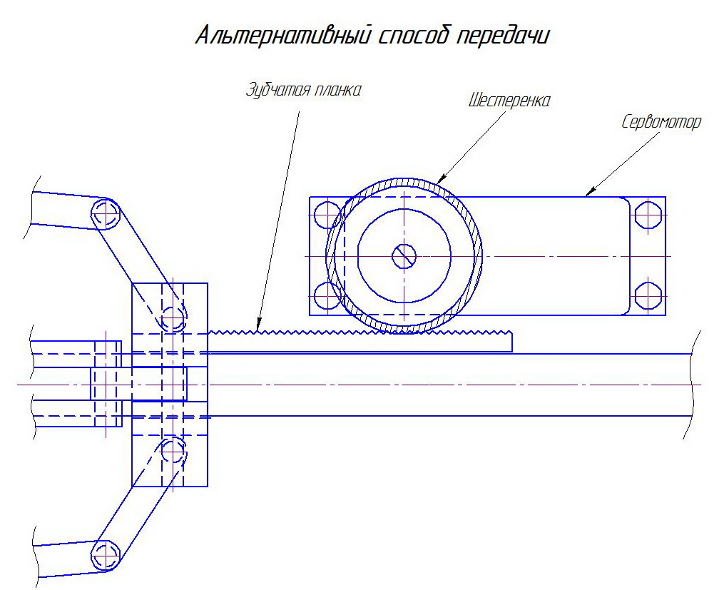 Альтернативный способ управления щупальцами. С помощью зубчатой планки (которая может быть выполенена из оргстекла) и шестеренки. Способ крепления сервомотора не показан. Можно как и в первом случае прикрепить к ГВ.