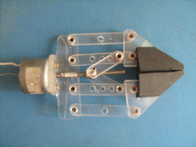Винт гайка ИМХО лучше, а ещё лучше: если уж редуктор - необходимость, так, наверное и дальше можно редуктировать без использования червей, т.е. мотор крепить перпендикулярно плоскости движения губок... только вот не могу сообразить как одной шестерёнкой в разные стороны две других вращать?