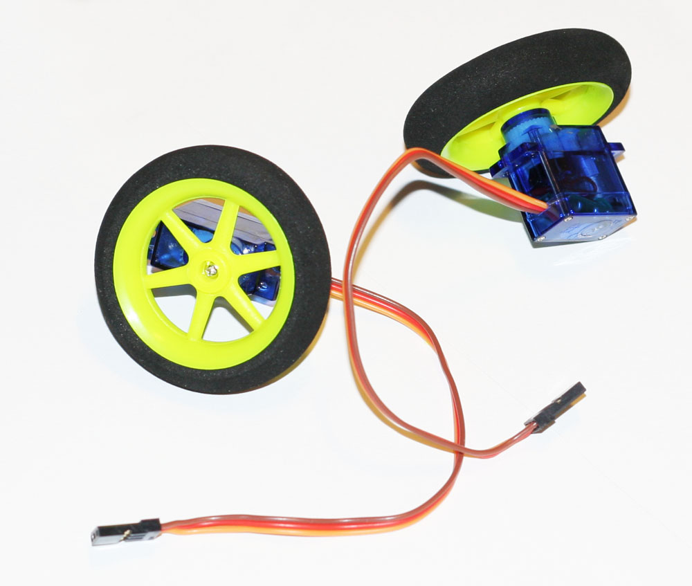 В колесе сверлом 4.3-4.4мм высверливается с 1 стороны отверстие под вал сервы (примерно 1.5-2мм) и с другой до этого отверстия вплотную, оставляя прокладку в 1мм примерно, чтобы за неё винтик прижимал колесо как качалку (главное не состыковаться с предыдущим - а то держаться будет не за что).