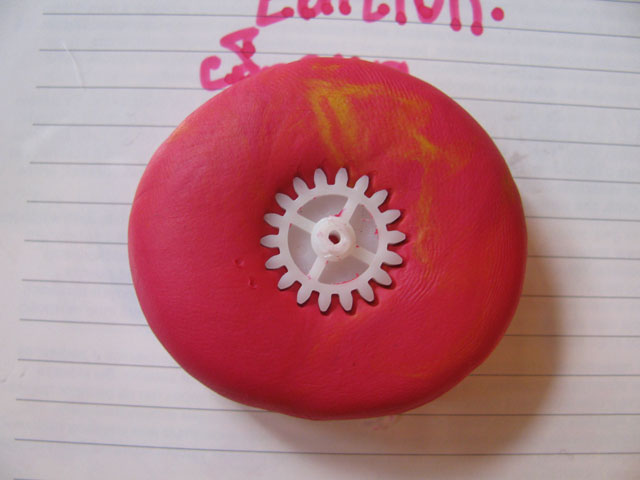 В пластиковой карточке надо сделать выемку под оську заготовки и оперев край карты на 2 края шестеренки ( рисунок 3 ) круговым движением сделать вокруг нее полскость на пластилине.