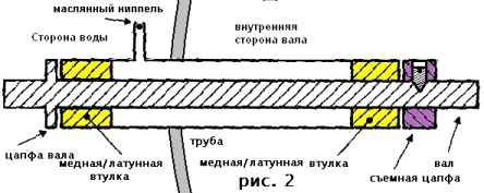почти на краю дейвудной трубки сделать вертикальный обрезок трубки в которую и набивается смазка,трубка закрывается крышечкой,гребной вал проходит через дейвудную трубу,канал смазки и выходит наружу из корпуса.