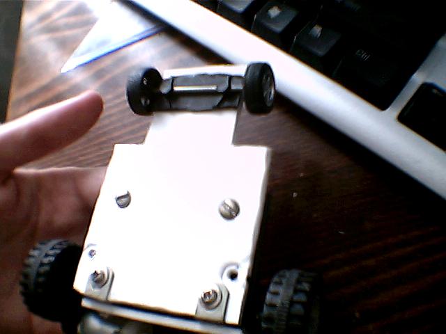 Береться вентилсятор Пиляться вот эти части, по краям там дырки для винтов, они слишком широкие для осей от игрушечной машинки, втыкаем туда отрезанные носики от шприцов,(на этой фотке носик уже отрезан, ну вы поняли) держиться идеально и диаметр отверстия как раз под ось., устанавливаем все это дело на основу, оси с колесами я закрепил маленькими гайками, полив их вместе с осью суперклеем ) ну сзади там моторы, на которые надеты резиновые валики вынутые из магнитофона.