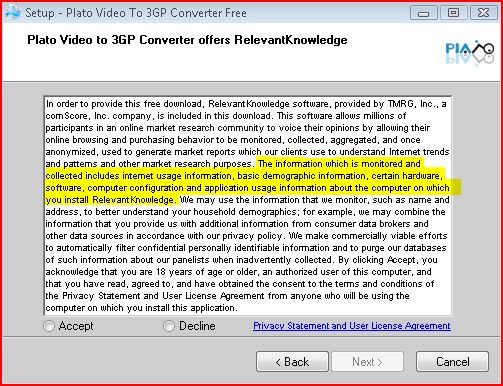 In order to provide this free download, Re le van t Kno wledge software, provided by T M R G, Inc., a com Sc ore, Inc. company, is included in this download. This software allows millions of participants in an online market research community to voice their opinions by allowing their online browsing and purchasing behavior to be monitored, collected, aggregated, and once anonymized, used to generate market reports which our clients use to understand Internet trends and patterns and other market research purposes. The information which is monitored and collected includes internet usage information, basic demographic information, certain hardware, software, computer configuration and application usage information about the computer on which you install Re le van t Kno wledge. We may use the information that we monitor, such as name and address, to better understand your household demographics; for example, we may combine the information that you provide us with additional information from consumer data brokers and other data sources in accordance with our privacy policy. We make commercially viable efforts to automatically filter confidential personally identifiable information and to purge our databases of such information about our panelists when inadvertently collected. By clicking Accept, you acknowledge that you are 18 years of age or older, an authorized user of this computer, and that you have read, agreed to, and have obtained the consent to the terms and conditions of the Privacy Statement and User License Agreement from anyone who will be using the computer on which you install this application.