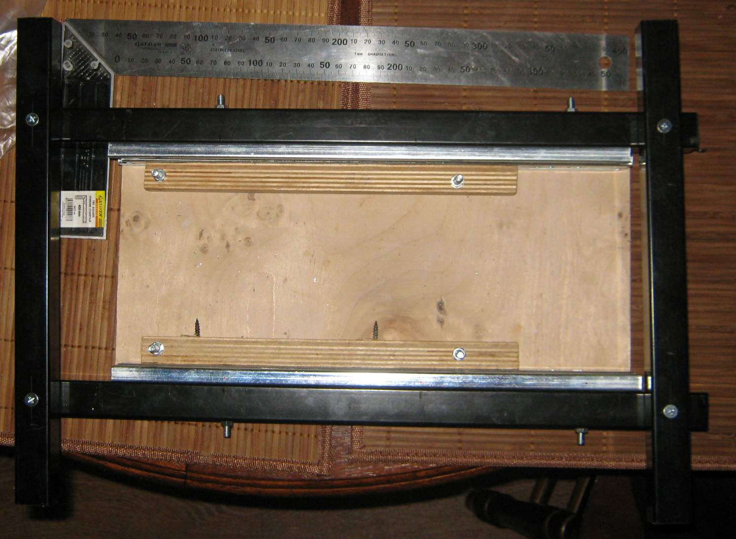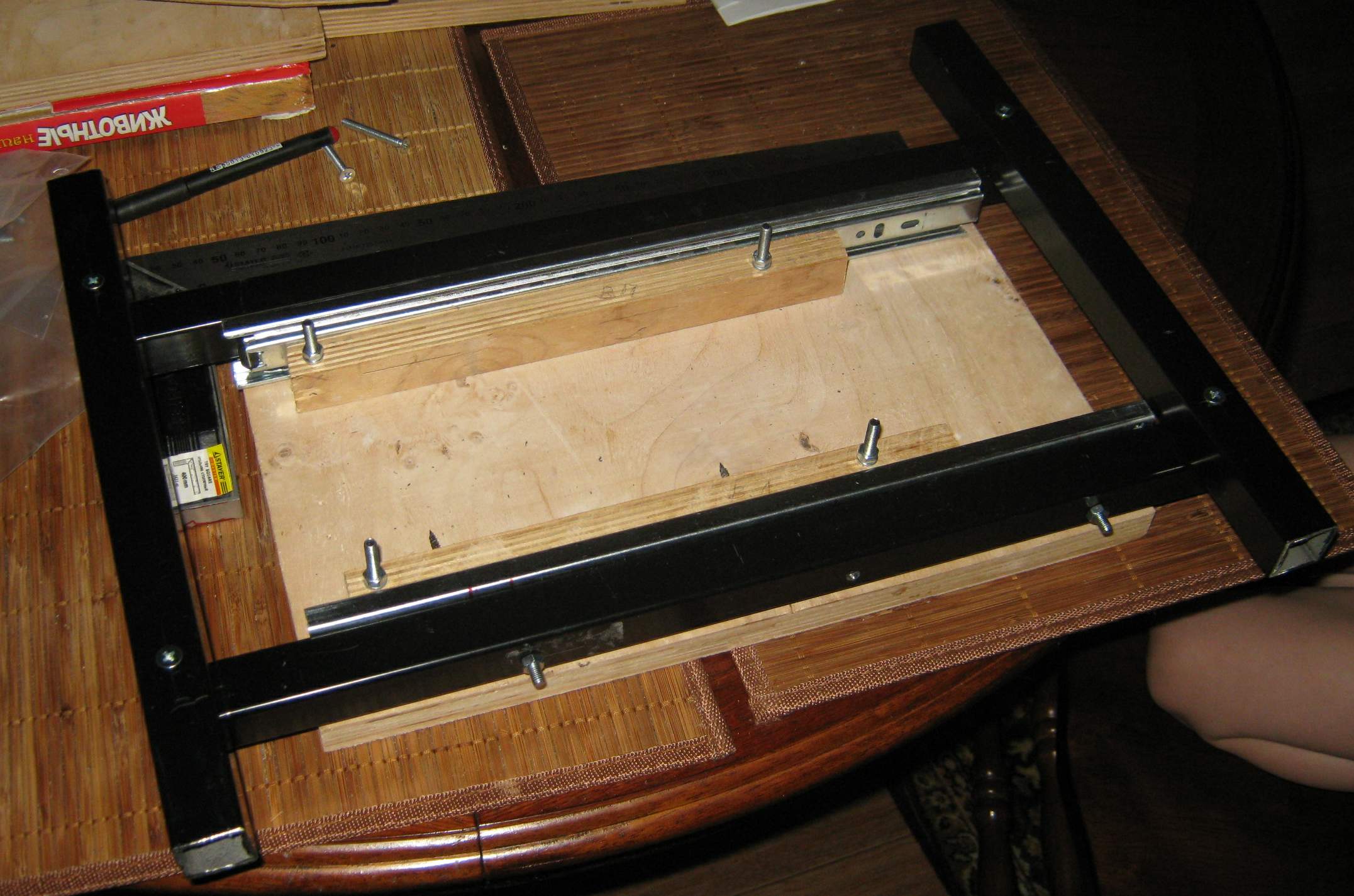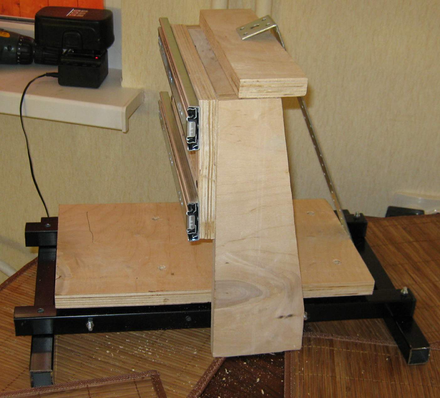Возьму уголок прикручу к нему втулки, верхнюю часть у втулок срежу (которая за уголок выступает). В уголке прорежу два отверстия под направляющие и посмотрим что получится.