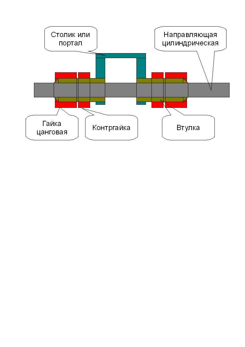 Делается втулка по типу цанги с внутренним размером чуть больше направляющей и с наружной резьбой, частью разрезная вдоль. Хвостовая часть вворачивается в столик (или портал), выполненный из швеллера (или еще как), а разрезная часть стягивается конусной гайкой до устранения люфта. Конусную гайку фиксируем контргайкой. При износе подтягиваем конусную гайку.