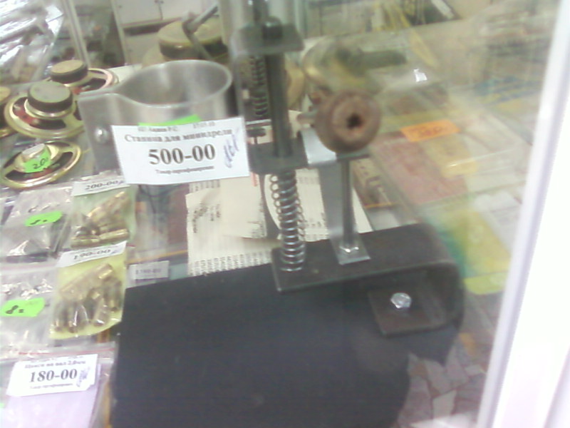 Набрел в магазине на станочек, точнее станину для станочка, там тока не хватает мотора с патроном....вот сфоткал.....(там же продавались и минидрели...мотор с патроном...маленькие от 500-1200 руб...в зависимости от мощности)