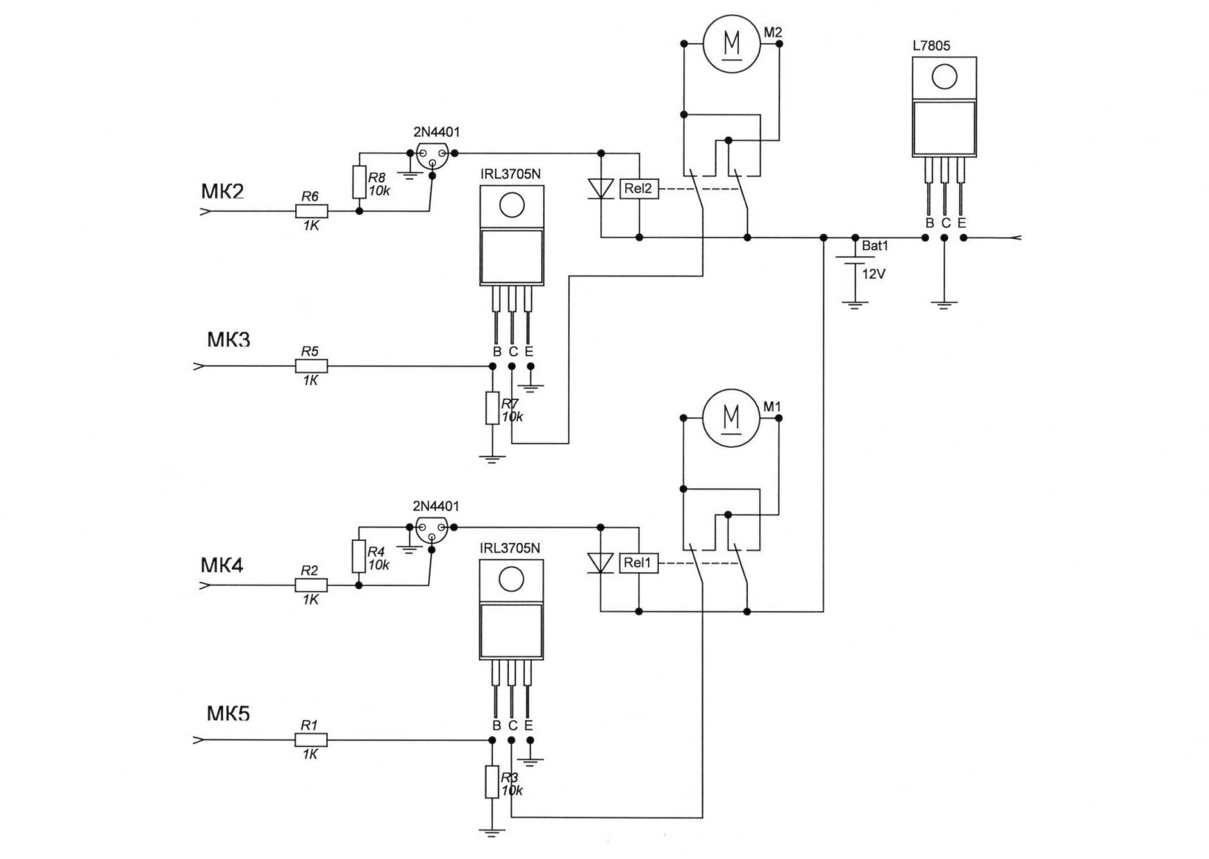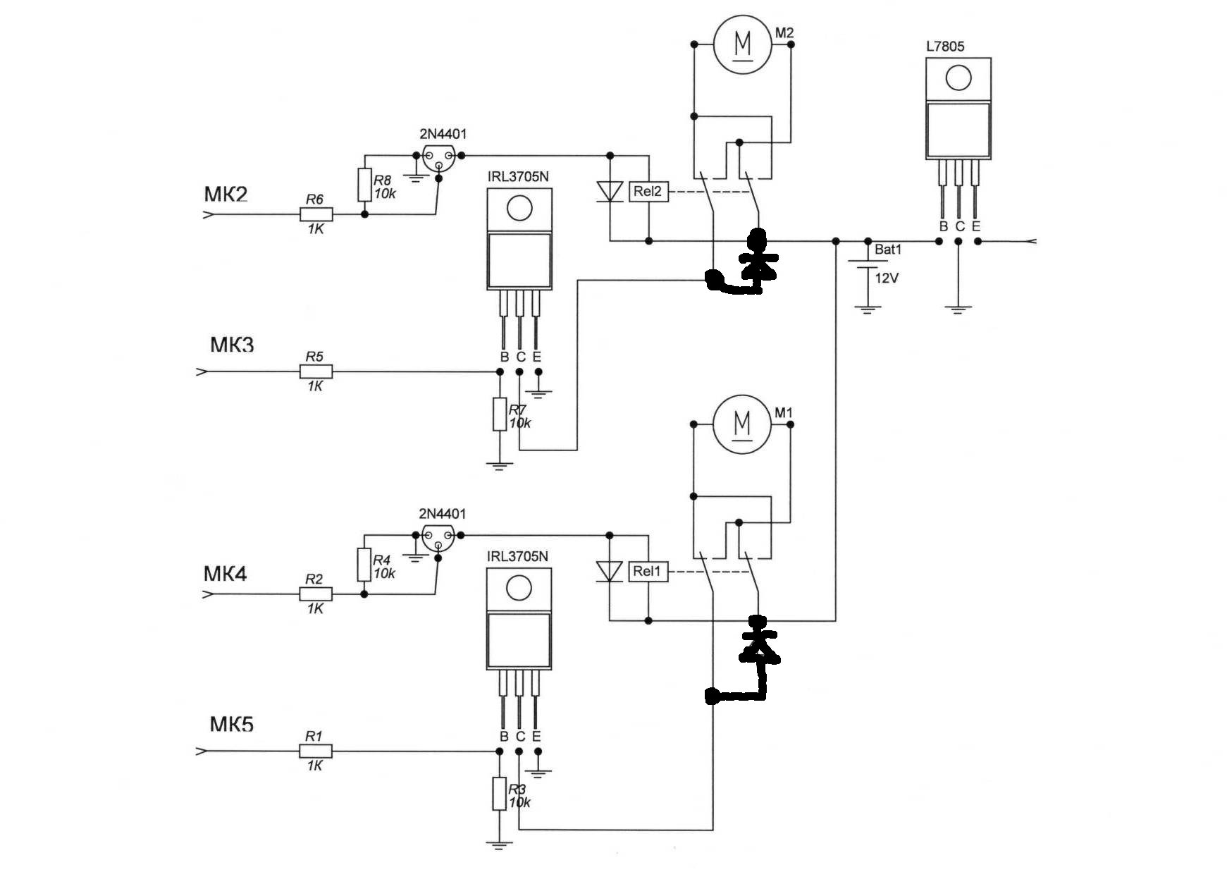 Печалька у меня . 1) одно реле не выдержало, походу контакты обгорели, щелкать щелкает, а толку нет. Придется наверное ставить мутантские автомобильные. Или искать схему нормального Н-моста на пиковый ток 8А, рабочий ~6. 2) Ардуино по прежнему хаотично виснет при активном использовании(гонялки туда сюда). Если отключить реле - не виснет, если отключить ШИМ - тоже не виснет. А все вместе виснет, иногда через 5 минут, иногда через 20. Поменял транзисторы 2N4401 на КТ972, та же фигня. Наверное нужно делать развязку через оптроны. Все против меня. Что я делаю не так?