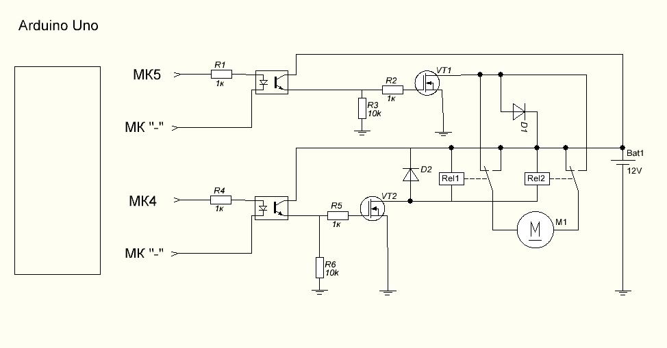 5) Сейчас что бы хоть что-то было, собрал на макетке Н-мост на 4-х автомобильных реле (дешево и сердито, они конечно большие, но зато работают как часы, и продаются везде) + транзисторы (ШИМ и включение реле) + установил оптроны для развязки. Т.е. развязка МК от силовой части сделана полная, надеюсь (просто прям, хочется быть уверенным) что теперь избавлюсь от зависания МК. Позже выложу схему, хочу получше подобрать детали и, наверное, остановлюсь пока на таком Н-мосте. Знакомый заказал драйверы мс33883, возможно удастся сделать нормальный Н-мост на материнских транзисторах.