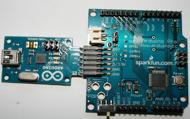 Прикупил платку Arduino Pro. Специально взял без USB, т.к. аппаратный UART мне будет нужен для управления моторчиками Dynamixel. Однако захотелось воспользоваться бутлоадером, как это делают все приличные люди. Взял переходник USB2SERIAL, который по сути является Arduino UNO с соответствующей прошивкой.