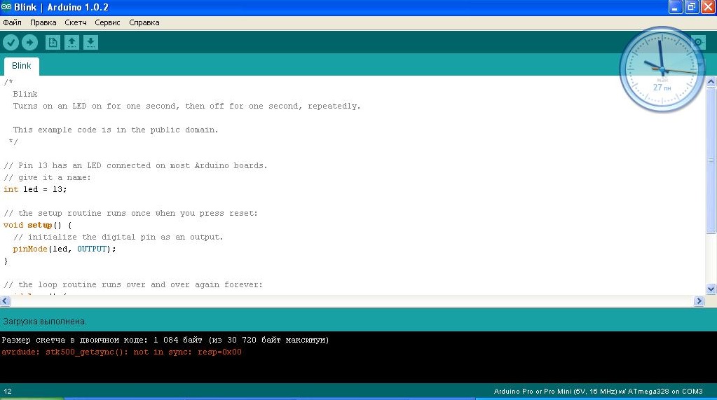 Установил на WinXP (с восьмеркой Arduino IDE виснет), открыл пример скетча с пресловутым мигающим светодиодом, попытался залить на платку, и вот что получил:
