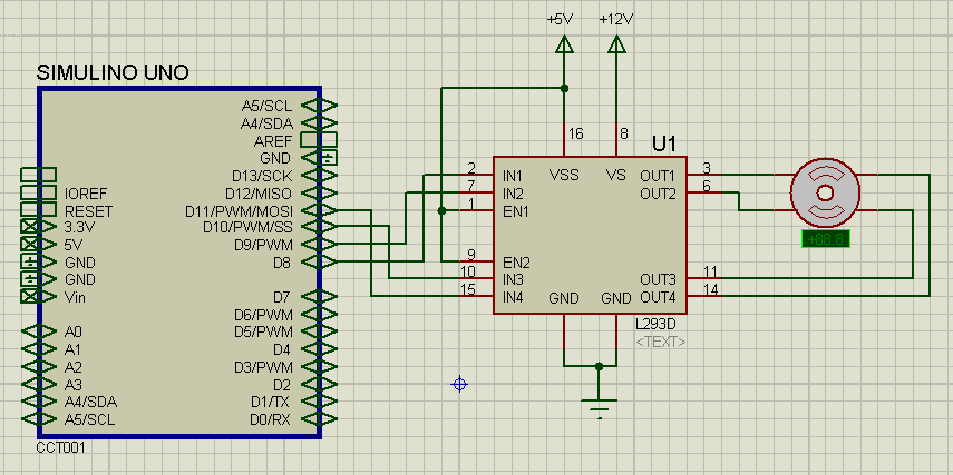 Скачал проект «SIMULINO» сделанный в Proteus, который имитирует Arduino. Проверил на нем работоспособность парочки легких программ с миганием светодиодов, вроде все работает отлично. Далее добавил драйвер L293D и биполярный шаговый двигатель. В свойствах шагового двигателя указал напряжение 12V и угол поворот 1 градус. Все, на этом работа в Proteus закончилась.