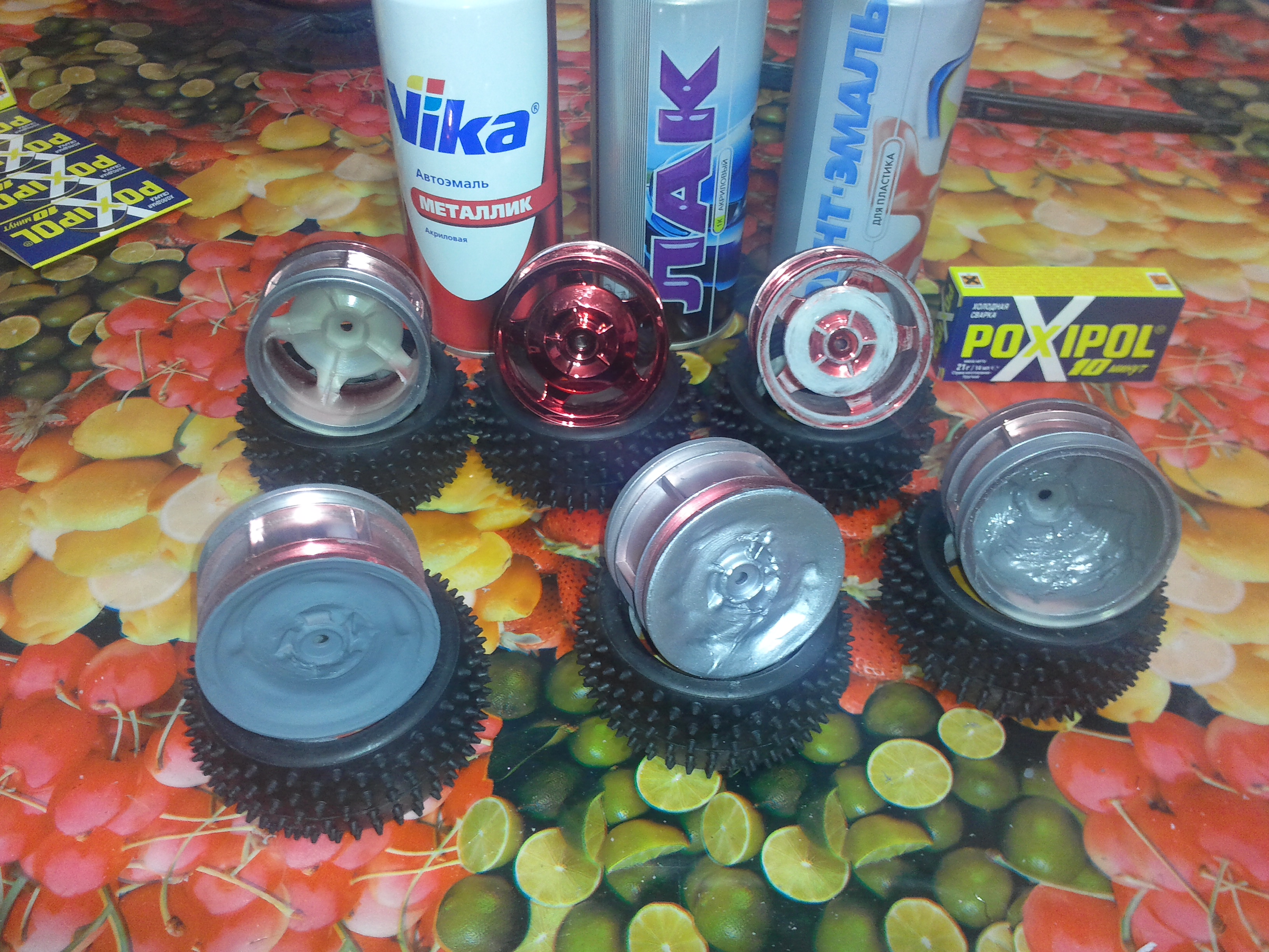 Вот и пришли колёса, выглядят очень хлипенько, за та по креплениям подходят идеально. Решил их усилить холодной сваркой и покрасить.....Старался не очень, т.к. главное функционал. Всё на фото...