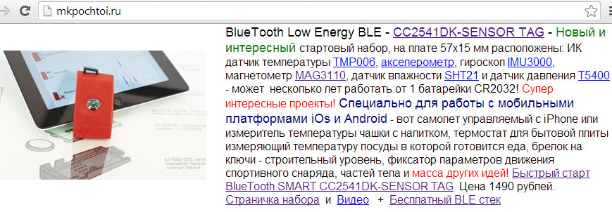 Специально для работы с мобильными платформами iOs и Android - вот самолет управляемый с iPhone или измеритель температуры чашки с напитком, термостат для бытовой плиты измеряющий температуру посуды в которой готовится еда, брелок на ключи - строительный уровень, фиксатор параметров движения спортивного снаряда, частей тела и масса других идей! Быстрый старт BlueTooth SMART CC2541DK-SENSOR TAG Страничка набора и Видео +