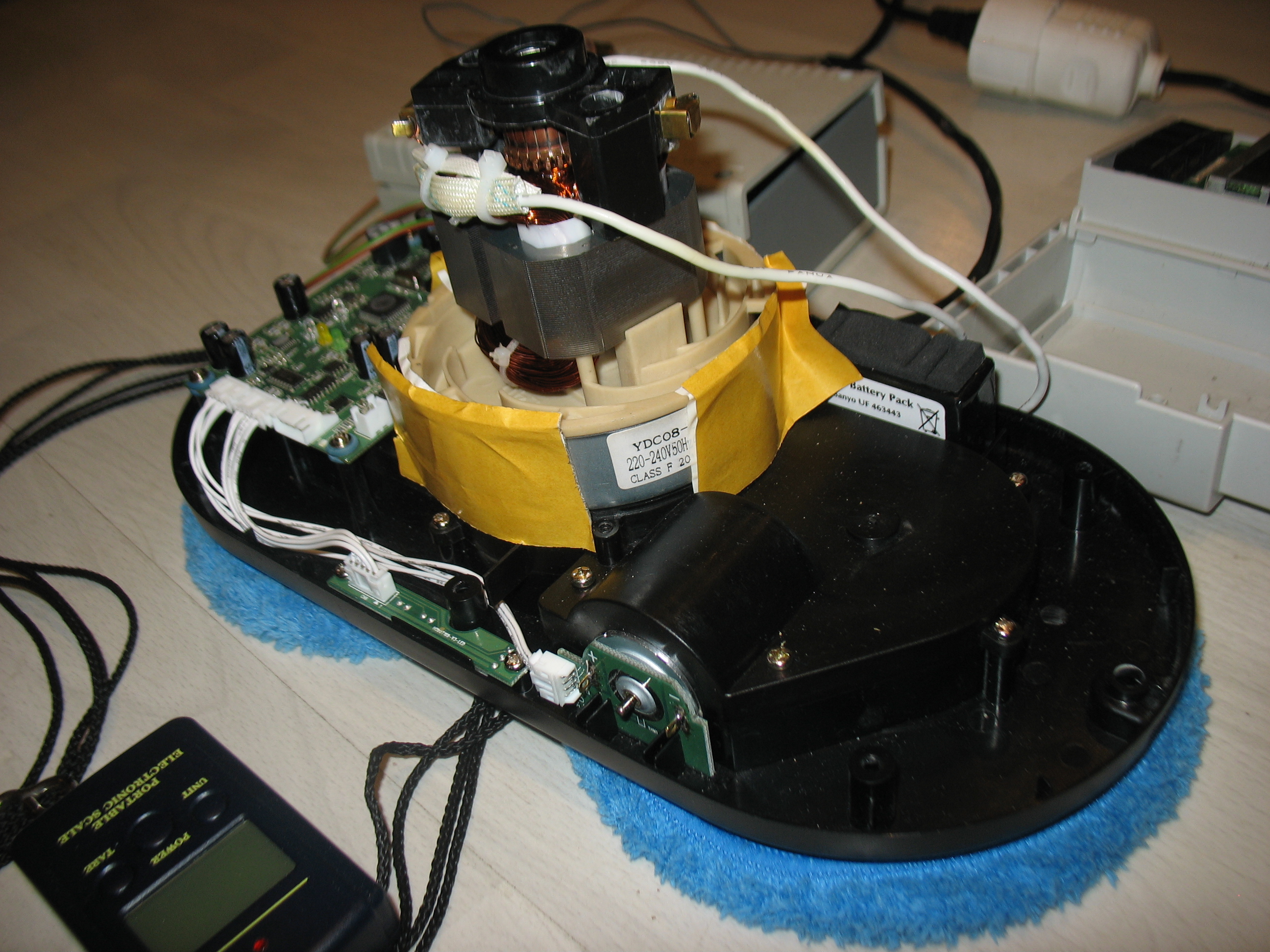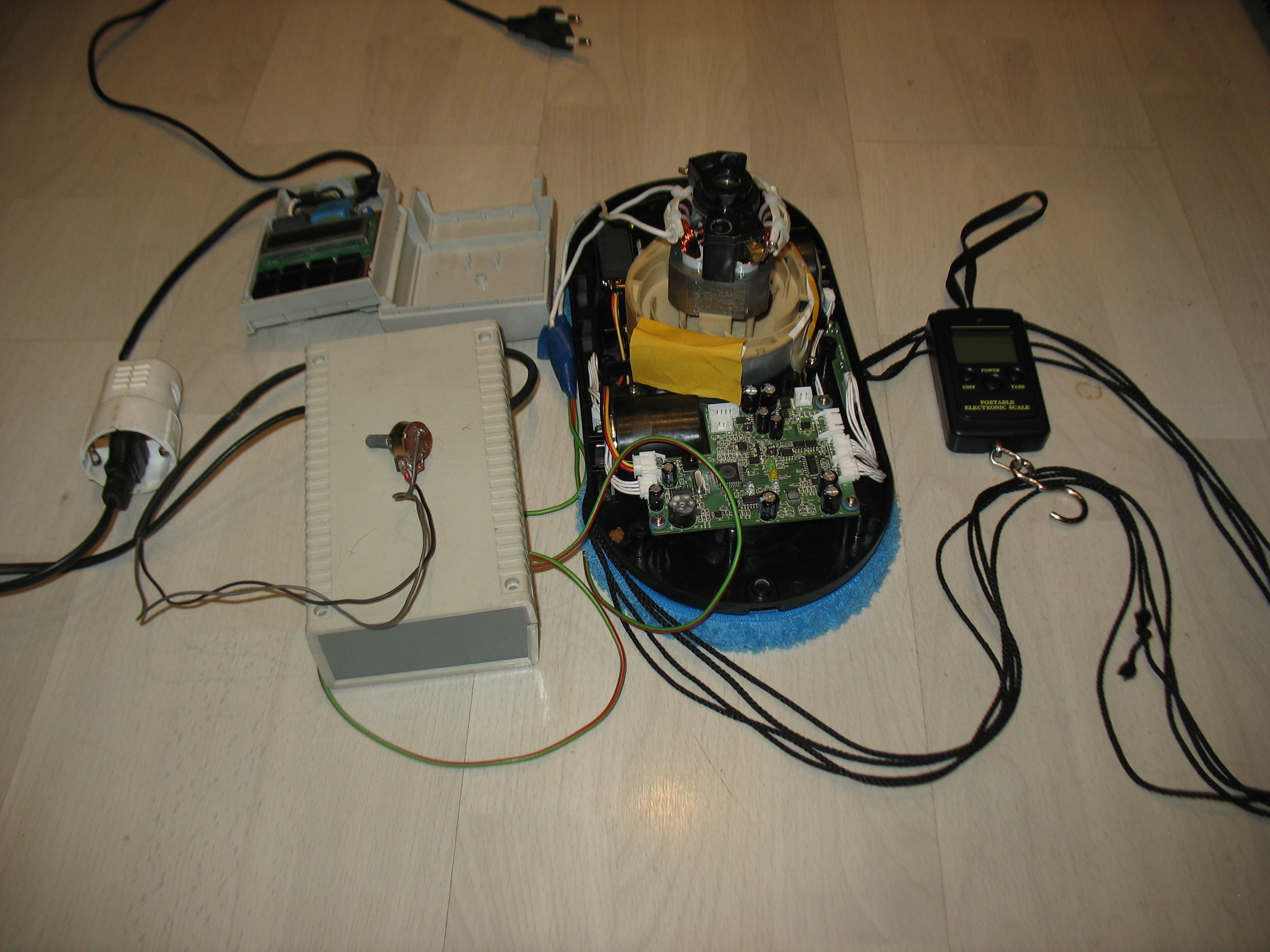 Слева вверху - измеритель мощности, самоделка. Слева внизу диммер от пылесоса LG. Ну и сам хобот с безменом. Вот так вкорячил мотор: