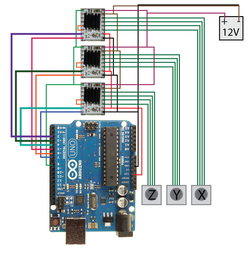 Использую arduino uno + контроллер A4988 + униполярные шаговые двигатели 4shg-023a39s.