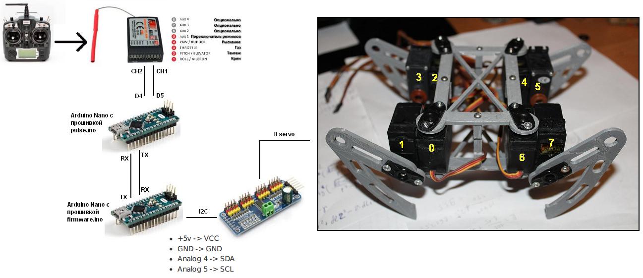 В программе PULSE.INO строки с 21 по 28 вычисляют скорость перемещения робота. Формулы подобраны вручную в зависимости от чувствительности стиков аппаратуры и положения триммеров. Arduino Nano (с программой PULSE) отправляет другой Arduino строку содержащую код движения и его скорость.
